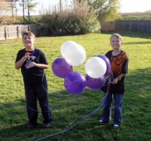 One told of a balloon release done in honor of her son, and that option had already crossed my mind today. Her suggestion reinforced my decision, and I took it as a sign from above to move forward with my original plan. Sunday, 11/6, our church will honor those members who have died this past year, and we’ll place a rose at the altar in Mark’s memory. What better way to prepare our boys for that ceremony than to make today a celebration of their daddy’s life? Balloons are fun and festive, and the boys were all for it. We talked about what a saint was, and they both agreed that Mark was a new saint and deserved a special ceremony to initiate him into the “club.” I brought home beautiful purple and white balloons, and we traipsed to our big backyard. One by one, we took turns, holding a balloon in our hands, as we talked to our daddy and husband. My mom even took a turn. I loved hearing the boys talk to their daddy, their love and faith is so pure, yet so simple. How I pray for the level of faith they have! Sure, there were a few tears…but the smiles and laughs far outnumbered them.